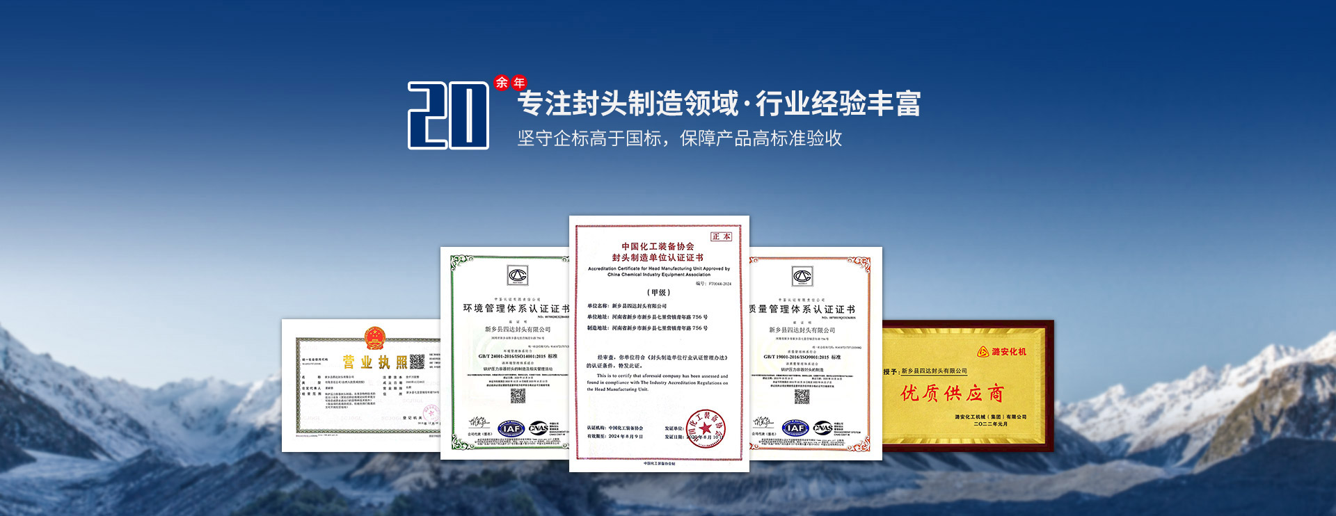 遵循國家標(biāo)準(zhǔn)、美國ASME標(biāo)準(zhǔn)生產(chǎn),取得A3級鍋爐壓力容器部件生產(chǎn)許可,中國化工裝備協(xié)會封頭甲級認(rèn)證,為產(chǎn)品提供資質(zhì)保障;